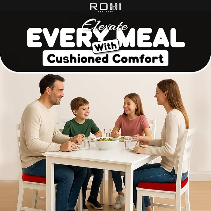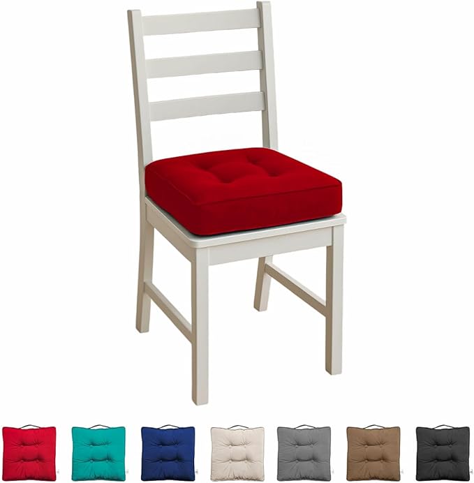 Each package includes one red armchair booster cushion measuring approximately 45 x 45 cm with a 10 cm thickness, featuring soft fibre filling, a durable 100 percent polyester cover, four tufted buttons, and piped edges on both sides for added structure.